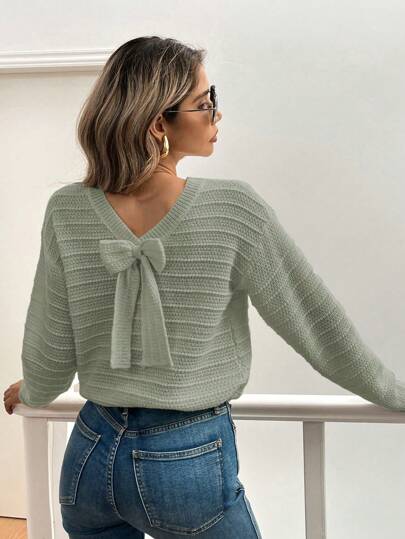 Elyressa Ladies Plain Color Long Sleeve Bow Decor Simple Casual Pullover Sweater, Long Sleeve Top Knit Pullover Fall Winter - Green - View 1