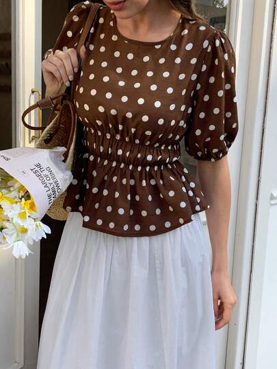 Elyressa Round Neck Raglan Sleeve Gathered Waist Ladies Woven Elegant Summer Blouse - Brown - View 1