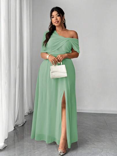 Elenzga Plus Size Women Elegant Wedding/Party Chiffon One-Shoulder High Slit Maxi Dress - Mint Green - View 1