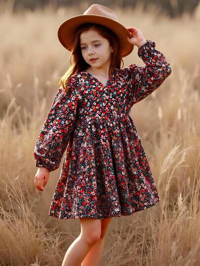 Emery Rose Kids Emery Rose Kids Tween Girl Ditsy Floral V Neck Lantern Long Sleeve Casual Boho A-Line Dress,Autumn Winter - Black - View 1