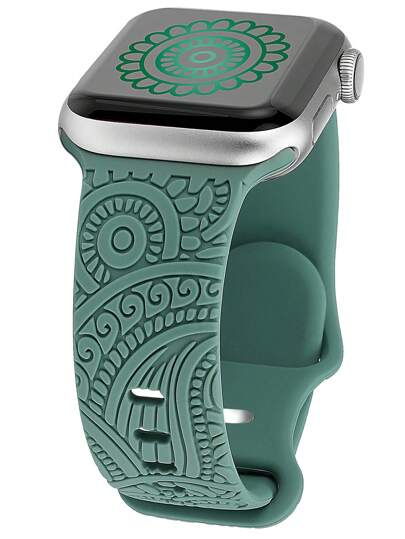 Engraved Band Compatible With Apple Watch Band 38mm 40mm 41mm 42mm 44mm 45mm 49mm For Women Men, Western Lace Silicone Fancy Sport Flower Straps Compatible With Series 9/8/7/6/5/4/3/2/1/SE/UItra As A Gift For Students Returning To School - Pine Green - View 1