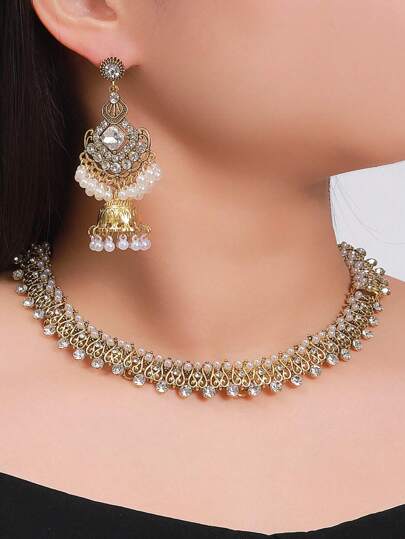 European And American Exaggerated Vintage Bohemian Faux Pearl Beaded Necklace Set Including Earrings And Collarbone Necklace With Rhinestone Details And Tassels - White - View 1