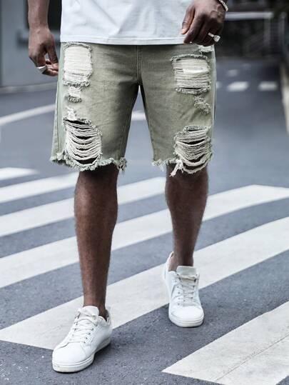 Manfinity RebelGame Men Plus Cotton Ripped Frayed Raw Hem Bermuda Denim Shorts - Army Green - View 1