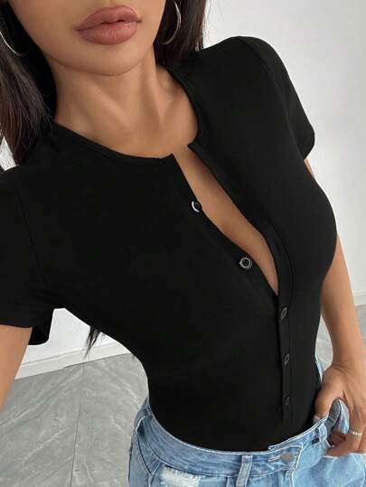 Flirla 1pc Black Half-Open Front Snap Button Tight-Fitting Bodysuit - Black - View 1