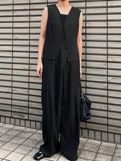 FRIFUL Women Black Jumpsuit, V-Neck Sleeveless Long Pants Straight Leg Pants, Spring Women Rompers Fall/Winter - Black - View 1