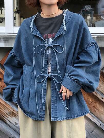 FRIFUL Women's Casual Everyday Frayed Hem Front Tie Drop Shoulder Denim Blouse, Autumn Long Sleeve - Blue - View 1