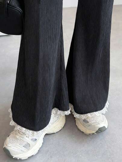 FRIFUL Women's Lace Trim Drawstring Waist Flare Leg Pants - Black - View 1