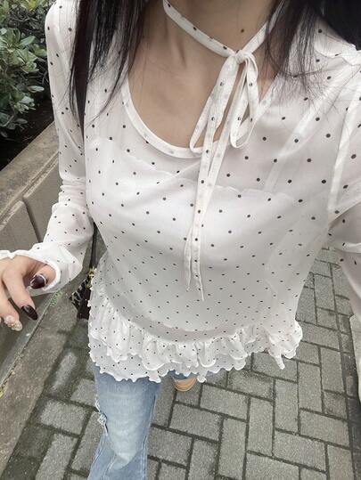 FRIFUL Women's Polka Dot Print Ruffle Hem Long Sleeve Sheer Blouse, Fashionable For Summer - White - View 1