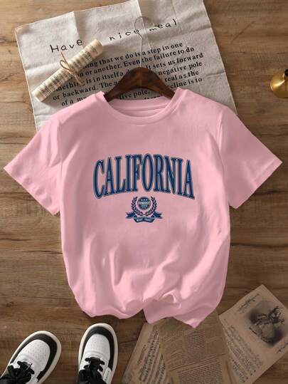 Letter Printed T-Shirt, Short-Sleeved Round Neck Summer And Spring Casual Top, Women's Clothing - Pink - View 1