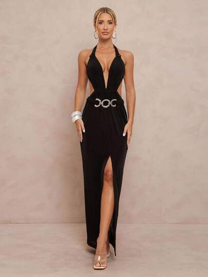 Lumalex Fall New Style WomenWinter Modest Old Money Coquette Glitter Holiday Party Glamour Elegant Rave Festival Outing Vacation Hot Outdoor Richly Layered Wedding Season Banquet Coming Of Age Ceremony Women's Sexy Metal Chain Accent Open Back High Split Hem Dress, Sleeveless High Slit Dress Night Out Dress Deep V Dress Halter Neck Dress Luxury Prom ID Al-Adha Al-Adha Party New Year - Black - View 1
