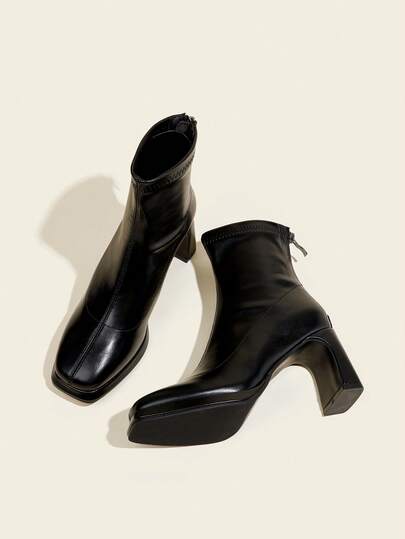 Fall/Winter 8cm Square Heel Women's Black Ankle Boots, Comfortable Block Heel, Back Zipper, Waterproof Platform, Chunky Heel Slim Boots,High Heels - Black - View 1