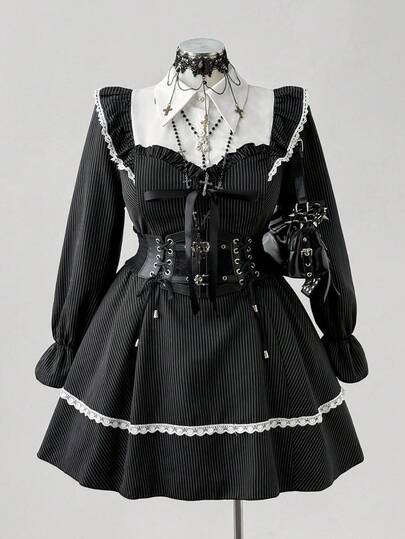 Sunspun Fall/Winter Elegant Collegiate Cute Sweet Striped Patchwork Design Princess Collar Puff Sleeve Lace Trim Waist Cinched Flared Hem Dress For Women - Multicolor - View 1