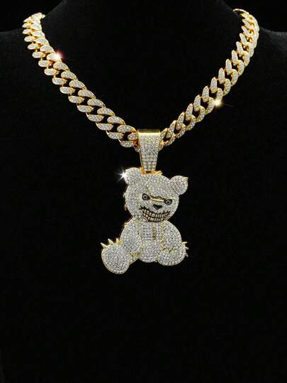 Fashion "NEVER GIVE UP" Full Rhinestone Hiphop Men's Pendant On Curb Chain Necklace - Cuban Bear Necklace - View 1