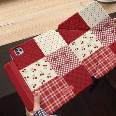 Fashionable Creative Red Plaid Patchwork Bow Cherry 3-In-1 Magnetic Cute Tablet Protective Case Compatible With Apple IPad 11th Gen, IPad Pro 2025 New, IPad Air 7/6 With Pencil Slot, Anti-Bend, 11-Inch, For Girls - Red - View 1