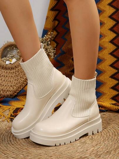 Fashion Slip-On Boots Women Knitted Ankle Boots Patchwork Boots Thick Bottom Boots Winter Boots Black Short Boots - Beige - View 1
