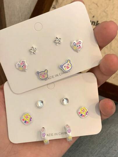 Fashionable Personalized Cat Ear Stud Set, Cute Animal, Flower, Star Design Earrings, Dopamine Earrings - Multicolor - View 7