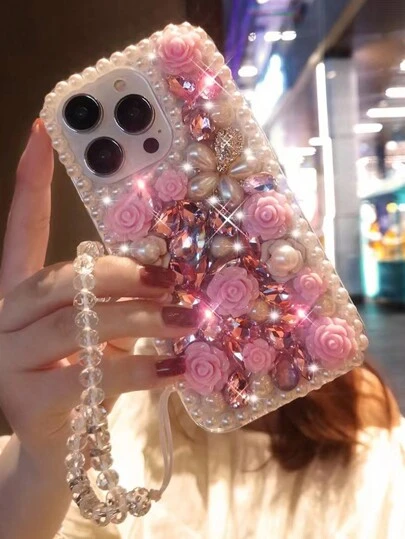 Valentines Sequins Fashion Luxury Faux Pearl Trim & Rhinestones Decor Crystal Bracelet Phone Case Compatible With Iphone 16 Pro Max, XR Waterproof Shockproof Anti-Fall Scratch Resistant - Pink - View 1