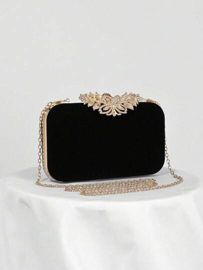 Fashionable Women's Shiny Diamond Flap Box Clutch Bag, Crystal Party Purse, Wedding Bride Wallet, Prom Bag, Black Velvet Bride Shoulder Bag With Chain - Black - View 1