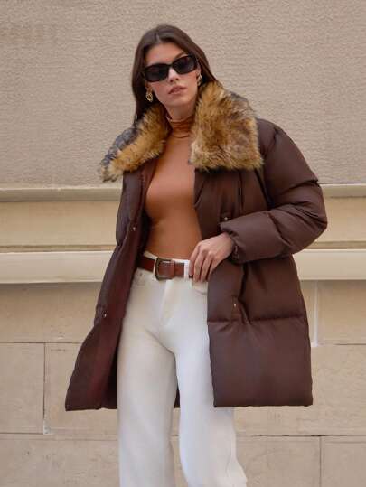 SHEIN Cottnline Faux Fur Collar Detailed Snap Buttoned Stylish Puffer Winter Coat - Brown - View 1