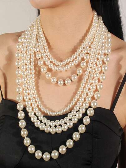 Faux Pearl Beaded Layered Necklace & Earrings - Beige - View 1