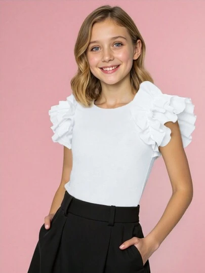 SHEIN Fern Glow  Tween Girls' Cute White Ruffle Sleeveless Casual Tank Top, Versatile For Summer - White - View 1