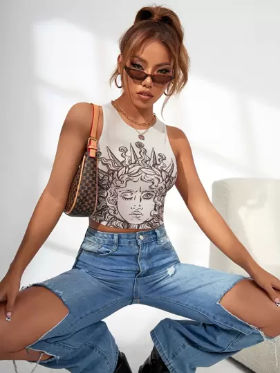 Muchica Figure & Letter Graphic Tank Top - Apricot - View 1