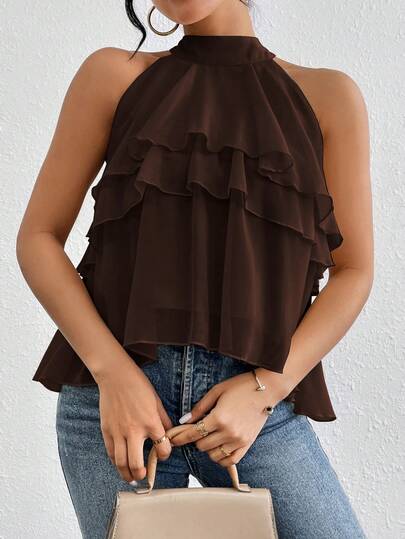Firerie Loose Neck Ruffle Asymmetrical Chiffon Blouse - Coffee Brown - View 1