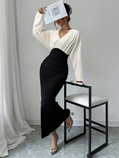 Firerie Women's Elegant Contrast Color Splice Batwing Sleeve Dress - Apricot - View 1