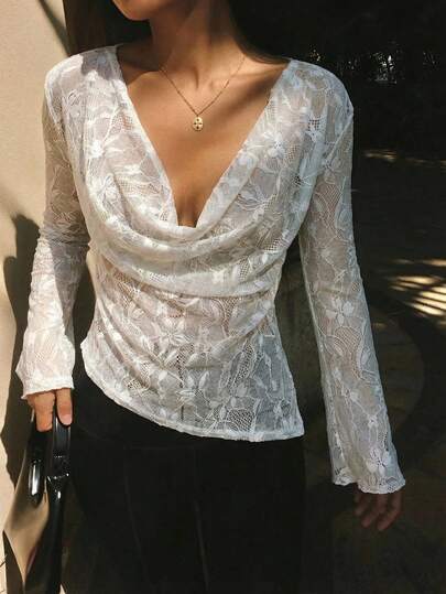 Firerie Women's Fashion Plunging Neck Asymmetrical Hem Semi-Sheer Lace Blouse - White - View 1