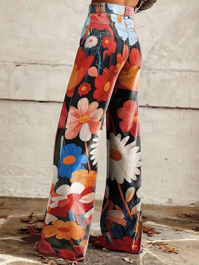 Fitted Casual Vacation Printed Crafted Fashion Creative Retro Printed Wide Leg Pants, Elegant Minimalist Chic For Daily Wear - Multicolor - View 1