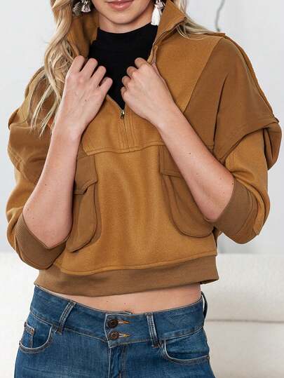 CILKOO Flap Pocket Half Zip Drop Shoulder Sweatshirt - Brown - View 1