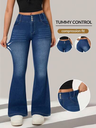 Flexra Women's Button Waist Pocket Design Flare Leg Casual Jeans - Medium Wash - View 1