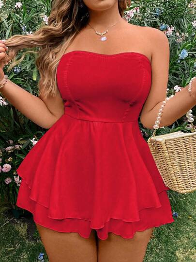 Flirla Plus Size Women Solid Color Bandeau Jumpsuit - Red - View 1