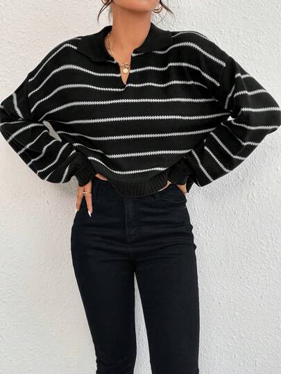 Almamuse Striped Pattern Drop Shoulder Sweater,Long Sleeve Tops Knit Pullover Fall Winter Outfit - Black and White - View 1