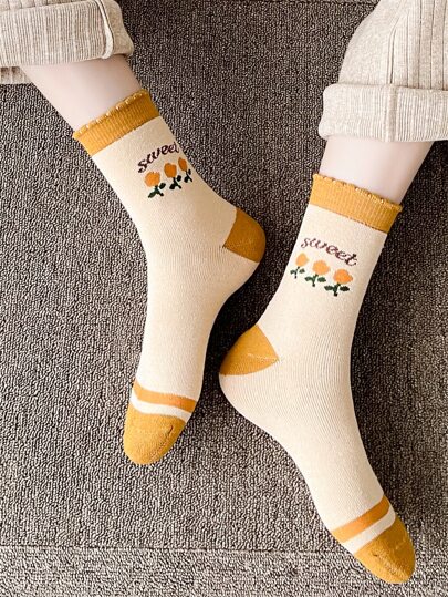 Floral & Letter Graphic Crew Socks - Yellow - View 1