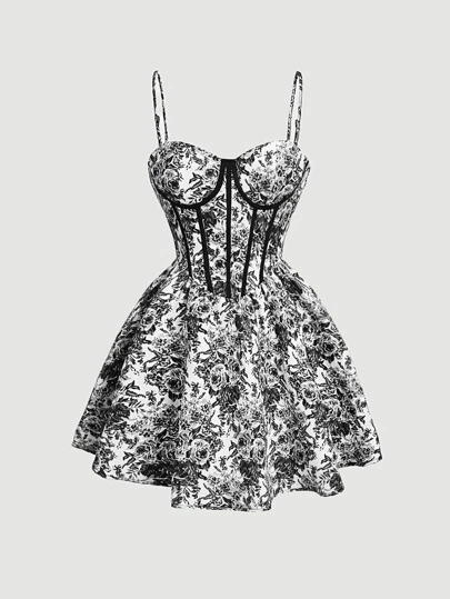 SHEIN MOD Floral Print Bustier Cami Dress Corset Dress - Black and White - View 1