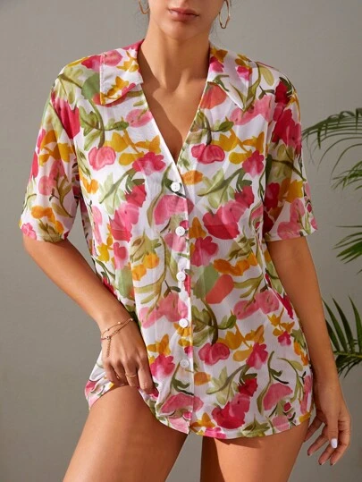 Summer Floral Print Button Front Kimono - Multicolor - View 1