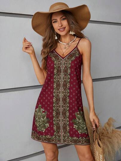 SHEIN VCAY Floral Print Cami Dress - Burgundy - View 1
