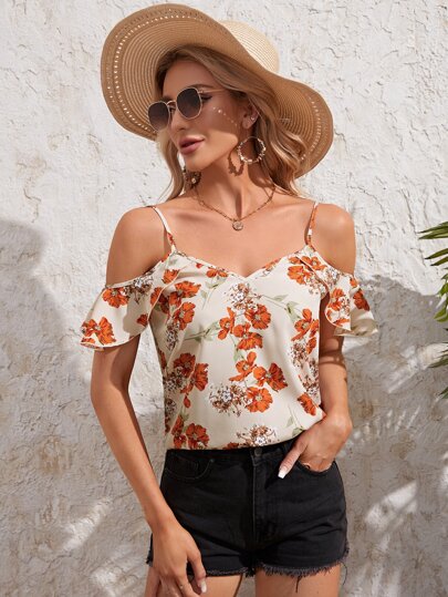 SHEIN VCAY Floral Print Cold Shoulder Blouse - Apricot - View 1