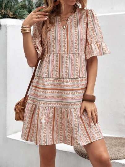 SHEIN Holidaya Floral Print Flounce Sleeve Ruffle Hem Smock Dress Vacation Beach Outfits Women - Multicolor - View 1