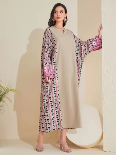 Al Najma Floral Print Notched Neckline Batwing Sleeve Kaftan Dress - Khaki - View 1
