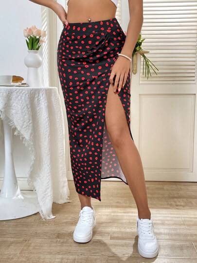 Breezaya Floral Print Pleated And Slit Skirt Fall Cloth For Women - Black - View 1
