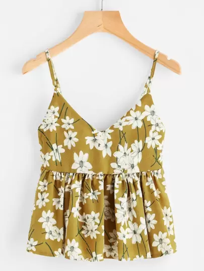 Floral Print Random Babydoll Cami Top - Mustard Yellow - View 1