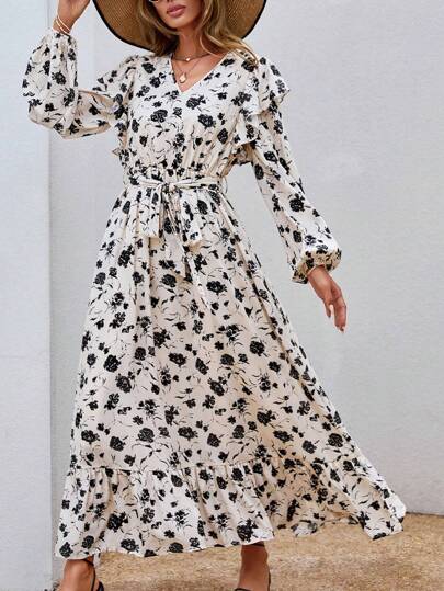 SHEIN VCAY Floral Print Ruffle Trim Belted Dress - Multicolor - View 1