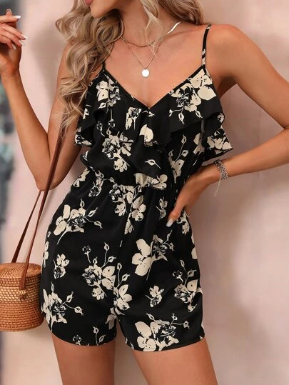 Breezaya Floral Print Ruffle Trim Cami Romper - Black - View 1