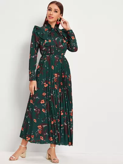 Mulvari Floral Print Ruffle Trim Tie Neck Pleated Dress - Dark Green - View 1