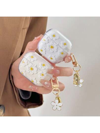 Ốp tai nghe TPU họa tiết hoa, phù hợp với Pro 2/1/2/3 thế hệ thứ 4, thiết kế hoa trắng thời trang, bảo vệ chống sốc kèm móc khóa, quà tặng cho bạn bè.
