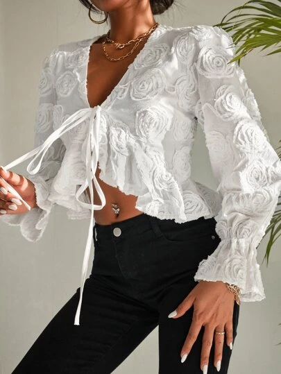 Flounce Sleeve Knot Front Ruffle Asymmetrical Hem Crop Blouse - White - View 1