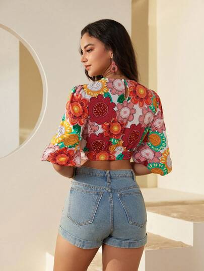 Aveloria Flower Print Round Neck Cropped Lantern Sleeve Blouse - Multicolor - View 6