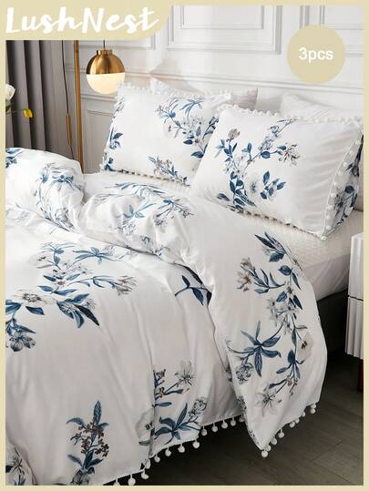 3pcs Floral Pom-Pom Duvet Cover Set, Available In Twin/Queen/King Size, Farmhouse Style Bedding Set, Includes 1 Duvet Cover With Zipper, 2 Pillow Shams, Super Soft Microfiber, Gift For Her - Multicolor - View 1